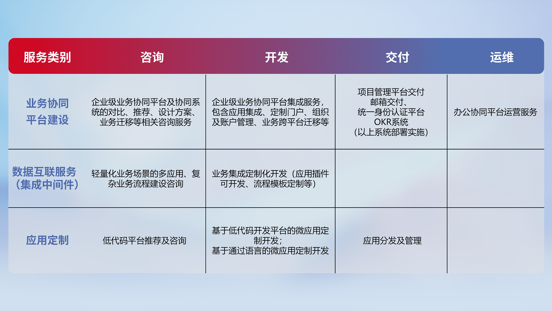 针对钉钉、、、、企微、、、、IDaas等平台级产品提供产品的规划、、、方案、、、交付、、、、定制化开发等服务,,实现如统一协同办公、、、智能客户服务、、、混合会议管理、、、、智能数据查询、、、等业务场景,,,实现数字化转型。。。
